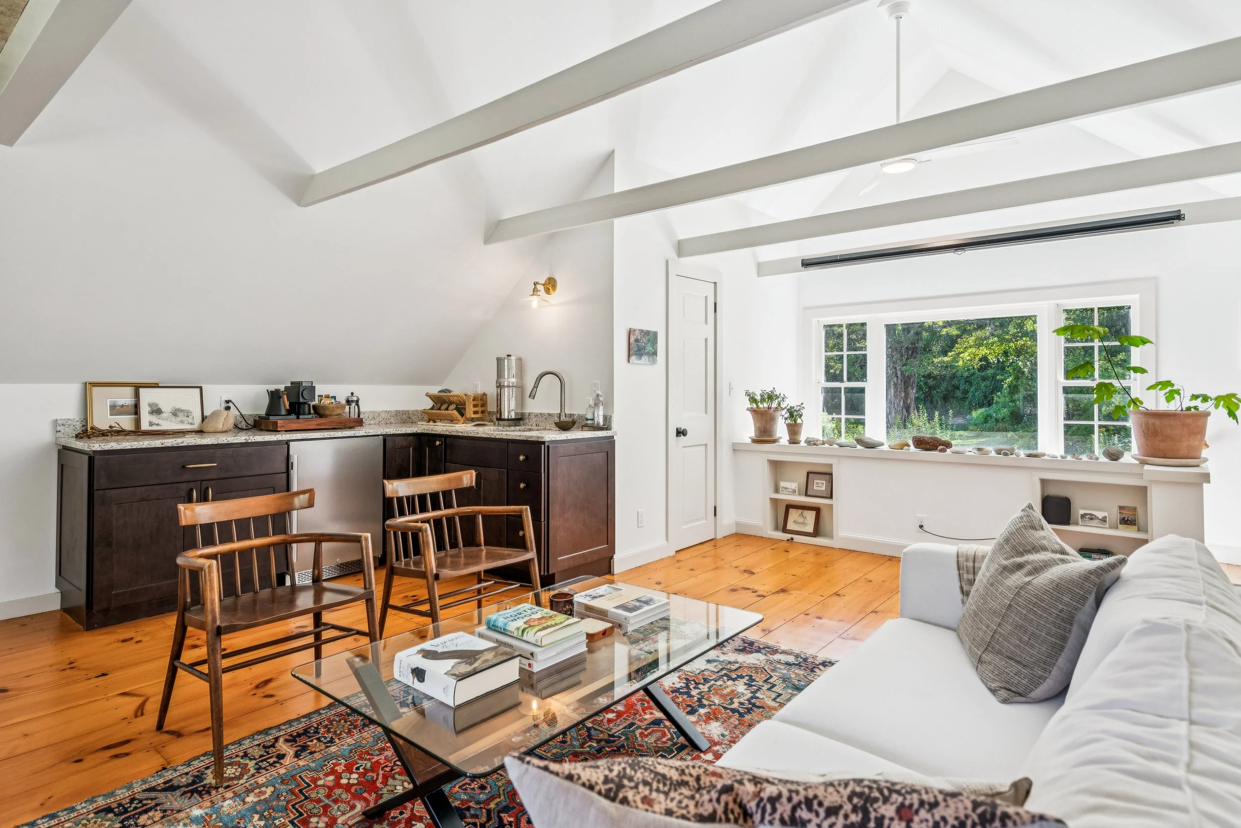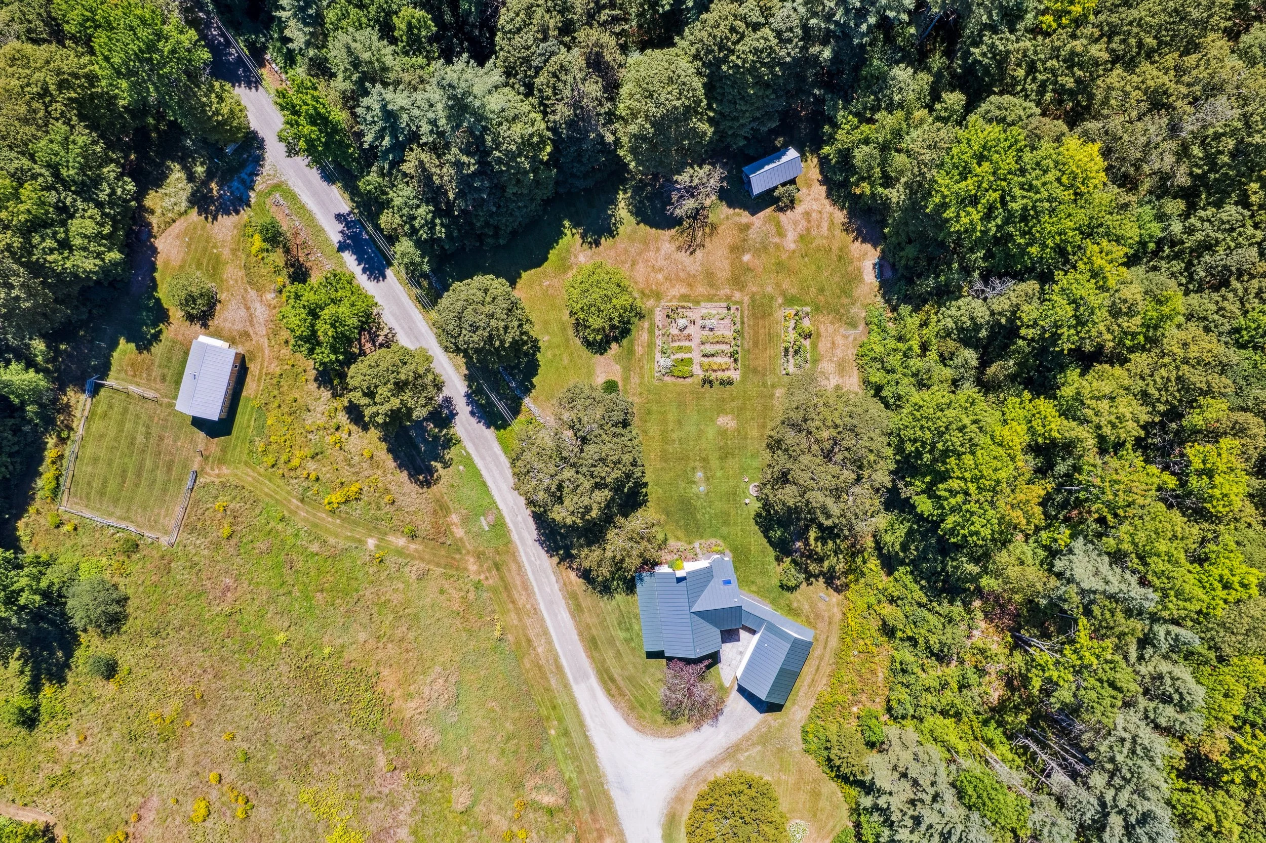 411 BENNETT ROAD- Perched on beautifully landscaped grounds with views of the neighboring hills and Sonnenberg ski area, this stylish and impeccably updated property is peaceful and private yet still just minutes from Silver Lake and the Barnard General Store. The interiors are bright and spacious with a well-appointed central kitchen/dining area overlooking the lovely grounds and views. The living room features exposed beams and is anchored by a cozy woodstove with tasteful tile façade, while a private library/office with built ins sits adjacent. On the second level is a sizable primary en suite bedroom with generous walk-in closets and two additional bedrooms that share a full bath. Over the garage is a separate bedroom suite with kitchenette, providing ample space to host family and friends. Across from the main house, a recently renovated barn with an office space and loft is versatile as either an art or music studio, exercise room, or rec space (and adds another approximately 800 SF of conditioned space). The land component includes 47+ mixed acres of manicured lawns, open fields, and woods with private hiking trails. Ideally sited on the south side of Barnard Village within 15 minutes of downtown Woodstock and Saskadena Six Ski Area, this turnkey gem offers a quiet retreat without compromising the convenience of the Upper Valley.